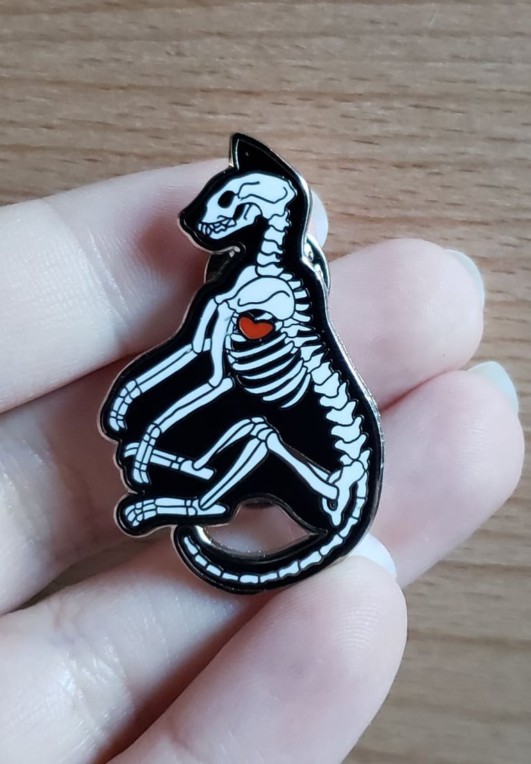 This one-of-a-kind pin was designed by me, featuring two of my favorite things: Skeletons and cats! This design was just updated in 2021 to be of better detailing!